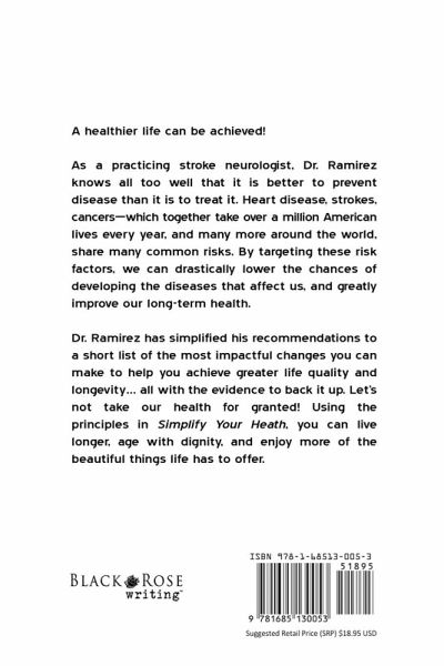 "In this easy-to-read guide, Dr. Ramirez highlights modern society's health patterns and provides the reader with applicable changes in order to improve their lives." -Sublime Book Review A healthier life can be achieved! As a practicing stroke neurologist, Dr. Ramirez knows all too well that it is better to prevent disease than it is to treat it. Heart disease, strokes, cancers-which together take over a million American lives every year, and many more around the world, share many common risks. By targeting these risk factors, we can drastically lower the chances of developing the diseases that affect us, and greatly improve our long-term health. Dr. Ramirez has simplified his recommendations to a short list of the most impactful changes you can make to help you achieve greater life quality and longevity... all with the evidence to back it up. Let's not take our health for granted! Using the principles in Simplify Your Heath, you can live longer, age with dignity, and enjoy more of the beautiful things life has to offer.