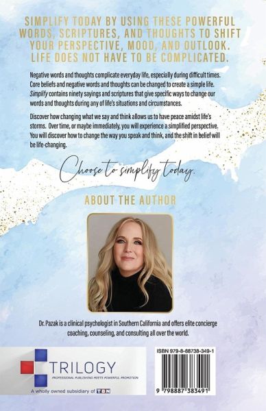 SIMPLIFY TODAY BY USING THESE POWERFUL WORDS, SCRIPTURES, AND THOUGHTS TO SHIFT YOUR PERSPECTIVE, MOOD, AND OUTLOOK. LIFE DOES NOT HAVE TO BE COMPLICATED. Negative words and thoughts complicate everyday life, especially during difficult times. Core beliefs and negative words and thoughts can be changed to create a simple life. Simplify contains ninety sayings and scriptures that give specific ways to change our words and thoughts during any of life's situations and circumstances. Discover how changing what we say and think allows us to have peace amidst life's storms. Over time, or maybe immediately, you will experience a simplified perspective. You will discover how to change the way you speak and think, and the shift in belief will be life-changing. Choose to simplify today.