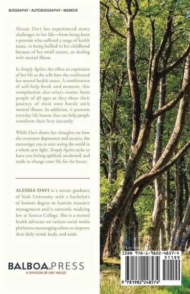 Simply Ageless is a remarkable expression of Alessia Davi's life as she overcomes her journey with suffering from Mental health. This self-help book also includes stories from people of all ages and their journey with their own battle with mental illness. Moreover, it touches upon everyday life lessons that many people are not aware can transfrom their lives instantly. This book leaves you feeling uplifted, awakened, and ready to change your life for the better.