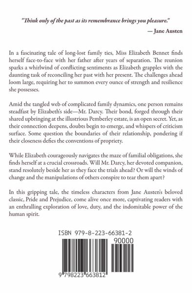 "Think only of the past as its remembrance brings you pleasure." - Jane Austen In a fascinating tale of long-lost family ties, Miss Elizabeth Bennet finds herself face-to-face with her father after years of separation. The reunion sparks a whirlwind of conflicting sentiments as Elizabeth grapples with the daunting task of reconciling her past with her present. The challenges ahead loom large, requiring her to summon every ounce of strength and resilience she possesses. Amid the tangled web of complicated family dynamics, one person remains steadfast by Elizabeth's side-Mr. Darcy. Their bond, forged through their shared upbringing at the illustrious Pemberley estate, is an open secret. Yet, as their connection deepens, doubts begin to emerge, and whispers of criticism surface. Some question the boundaries of their relationship, pondering if their closeness defies the conventions of propriety. While Elizabeth courageously navigates the maze of familial obligations, she finds herself at a crucial crossroads. Will Mr. Darcy, her devoted companion, stand resolutely beside her as they face the trials ahead? Or will the winds of change and the manipulations of others conspire to tear them apart? In this gripping tale, the timeless characters from Jane Austen's beloved classic, Pride and Prejudice, come alive once more, captivating readers with an enthralling exploration of love, duty, and the indomitable power of the human spirit.