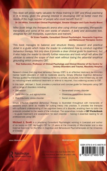 Research shows that cognitive behaviour therapy (CBT) is an effective treatment for common mental health disorders of mild to moderate severity. Simply Effective Cognitive Behaviour Therapy guides the therapist in treating clients effectively in a simple, structured, time-limited way, as well as indicating where additional treatment or referral is required, thus widening access to CBT. In this book, Michael J. Scott provides a practical and concise guide for therapists using CBT with a range of disorders including: depression panic disorder and agoraphobia post-traumatic stress disorder generalised anxiety disorder obsessive compulsive disorder social phobia. Simply Effective CBT is illustrated throughout with transcripts of sessions which serve as models for putting theory into practice. It provides the therapist with sufficient understanding of the cognitive theory of a disorder, enabling them to tailor the protocols provided to the needs of the individual. The appendices include a CBT Pocketbook - to guide treatment and assessment for each disorder - making it essential reading for all professionals using CBT.