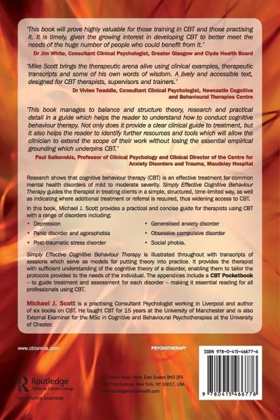 Research shows that cognitive behaviour therapy (CBT) is an effective treatment for common mental health disorders of mild to moderate severity. Simply Effective Cognitive Behaviour Therapy guides the therapist in treating clients effectively in a simple, structured, time-limited way, as well as indicating where additional treatment or referral is required, thus widening access to CBT. In this book, Michael J. Scott provides a practical and concise guide for therapists using CBT with a range of disorders including: depression panic disorder and agoraphobia post-traumatic stress disorder generalised anxiety disorder obsessive compulsive disorder social phobia. Simply Effective CBT is illustrated throughout with transcripts of sessions which serve as models for putting theory into practice. It provides the therapist with sufficient understanding of the cognitive theory of a disorder, enabling them to tailor the protocols provided to the needs of the individual. The appendices include a CBT Pocketbook - to guide treatment and assessment for each disorder - making it essential reading for all professionals using CBT.