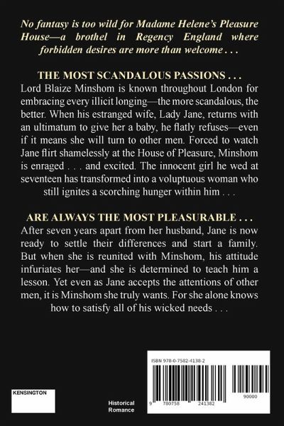 No fantasy is too wild for Madame Helene's Pleasure House--a brothel in Regency England where forbidden desires are more than welcome. . . The Most Scandalous Passions. . . Lord Blaize Minshom is known throughout London for embracing every illicit longing--the more scandalous, the better. When his estranged wife, Lady Jane, returns with an ultimatum to give her a baby, he flatly refuses--even if it means she will turn to other men. Forced to watch Jane flirt shamelessly at the House of Pleasure, Minshom is enraged. . .and excited. The innocent girl he wed at seventeen has transformed into a…mehr