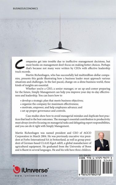Companies get into trouble due to ineffective management decisions, but most books on management don't focus on making better choices. Perhaps that's because not many were written by CEOs with effective leadership track records. Martin Richenhagen, who has successfully led multimillion-dollar companies, presents this guide illustrating how a business leader must approach various situations and challenges. In the fast-paced, change-on-a-dime business world, these kinds of insights are essential. Whether you're a CEO, a senior manager, or an up-and-comer preparing for the future, Simply Management can help you improve your day-to-day effectiveness and leadership. You can learn how to ¿ develop a strategic plan that meets business objectives; ¿ organize the company for maximum effectiveness; ¿ motivate, empower, and help employees advance; and ¿ set up proper governance and controls. Case studies show how to avoid managerial mistakes and duplicate best practices that lead to the best outcomes. The manager's essential contribution to productivity must always involve focusing on managerial tasks and delegating expert responsibilities, and you can do it right with Simply Management.