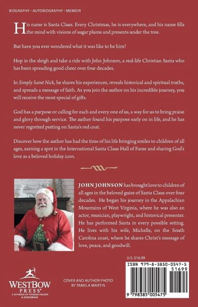 His name is Santa Claus. Every Christmas, he is everywhere, and his name fills the mind with visions of sugar plums and presents under the tree. But have you ever wondered what it was like to be him? Hop in the sleigh and take a ride with John Johnson, a real-life Christian Santa who has been spreading good cheer over four decades. In Simply Saint Nick, he shares his experiences, reveals historical and spiritual truths, and spreads a message of faith. As you join the author on his incredible journey, you will receive the most special of gifts. God has a purpose or calling for each and every one of us, a way for us to bring praise and glory through service. The author found his purpose early on in life, and he has never regretted putting on Santa's red coat. Discover how the author has had the time of his life bringing smiles to children of all ages, earning a spot in the International Santa Claus Hall of Fame and sharing God's love as a beloved holiday icon.