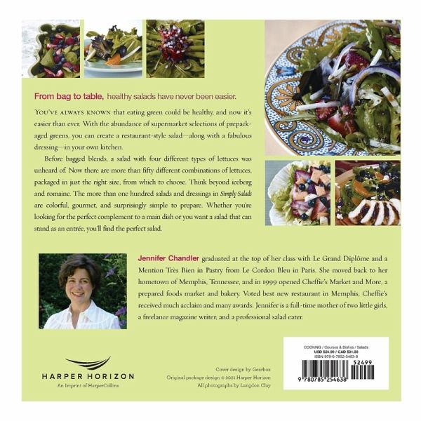 With the abundance of supermarket selections of prepackaged greens, you can create a restaurant-style salad along with a fabulous dressing in your own kitchen easier than ever. Before bagged blends, a salad with four different types of lettuces was unheard of. Now there are more than fifty different combinations of lettuces, packaged in just the right size, from which to choose. Think beyond iceberg and romaine. Chef and author Jennifer Chandler shows off more than one hundred salads and dressings that are colorful, gourmet, and surprisingly simple to prepare. In Simply Salads, Chandler shares scrumptious salad recipes such as: * Asian Salad with Ginger Dressing and Wasabi Peas * Jalapeño Chicken Salad with Avocado Dressing * Crawfish Salad with Spicy Cajun Remoulade * Cheese Tortellini Salad with Sun-Dried Tomato Vinaigrette * Memphis Mustard Cole Slaw Whether you're looking for the perfect complement to a main dish or you want a salad that can stand as an entrée, you'll find the perfect salad within Simply Salads. You've always known eating greens are healthy and now, making healthy salads have never been easier.