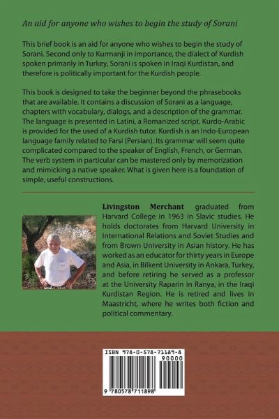 An aid for anyone who wishes to begin the study of Sorani. This brief book is an aid for anyone who wishes to begin the study of Sorani. Second only to Kurmanji in importance, the dialect of Kurdish spoken primarily in Turkey, Sorani is spoken in Iraqi Kurdistan, and therefore is politically important for the Kurdish people. This book is designed to take the beginner beyond the phrasebooks that are available. It contains a discussion of Sorani as a language, chapters with vocabulary, dialogs, and a description of the grammar. The language is presented in Latini, a Romanized script. Kurdo-Arabic is provided for the used of a Kurdish tutor. Kurdish is an Indo-European language family related to Farsi (Persian). Its grammar will seem quite complicated compared to the speaker of English, French, or German. The verb system in particular can be mastered only by memorization and mimicking a native speaker. What is given here is a foundation of simple, useful constructions.