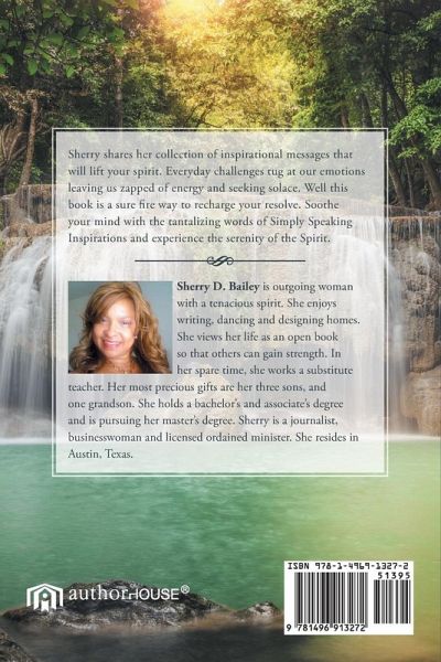 Sherry shares her collection of inspirational messages that will lift your spirit. Everyday challenges tug at our emotions leaving us zapped of energy and seeking solace. Well this book is a sure fire way to recharge your resolve. Soothe your mind with the tantalizing words of Simply Speaking Inspirations and experience the serenity of the Spirit.