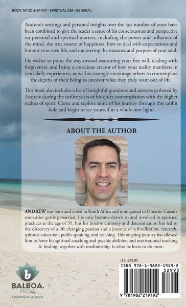 Andrew's writings and personal insights over the last number of years have been combined to give the reader a sense of his consciousness and perspective on personal and spiritual matters, including the power and influence of the mind, the true source of happiness, how to deal with expectations and honour your own life, and uncovering the treasures and purpose of your soul. He wishes to point the way toward examining your free will, dealing with forgiveness, and being a conscious creator of how your reality manifests in your daily experiences, as well as strongly encourage others to contemplate the depths of their being to uncover what they truly want out of life. This book also includes a list of insightful questions and answers gathered by Andrew during the earlier years of his quiet contemplation with the higher realms of spirit. Come and explore some of his journey through this rabbit hole and begin to see yourself in a whole new light!