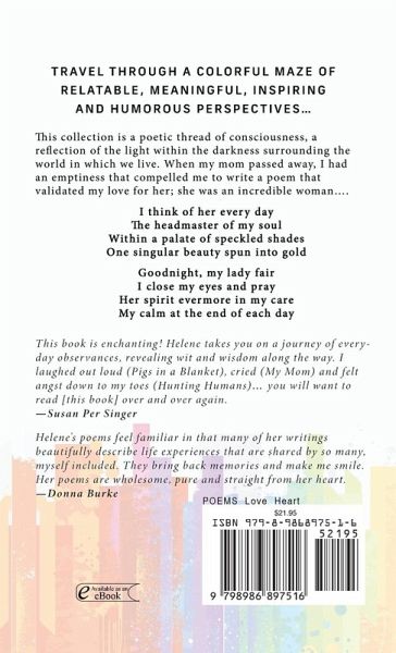 Simply Stated is a collection of poetry selected from over two decades of Helene Nelson's work. What began as a hobby blossomed into a passion for writing whatever was on her mind. Become a part of this journey as you walk through Helene's perspectives on life and love, good times, bad times, and all the in-between times. An easy read filled with observations and speculation, compassion, uplifting and funny stories, and an imaginary realm we all fantasize about in one way or another. You'll enjoy this book for its genuine storytelling, lighthearted and serious moments, and relatable content.