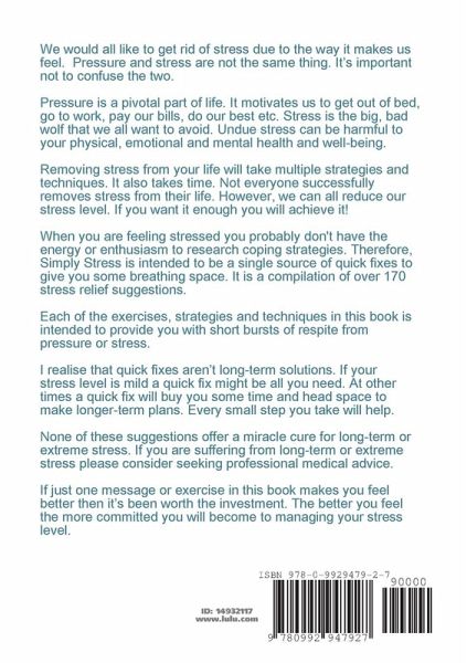 We would all like to get rid of stress due to the way it makes us feel. Pressure and stress are not the same thing. Pressure is a pivotal part of life; while stress is the big, bad wolf we all want to avoid. Simply Stress is a compilation of over 170 stress relief suggestions. Each of the exercises, strategies and techniques in this book is intended to provide you with short bursts of respite from pressure or stress. I realise that quick fixes aren't long-term solutions. If your stress level is mild a quick fix might be all you need. At other times a quick fix will buy you some time and head space to make longer-term plans. Every small step you take will help. If just one message or exercise in this book makes you feel better then it's been worth the investment. The better you feel the more committed you will become to managing your stress level.