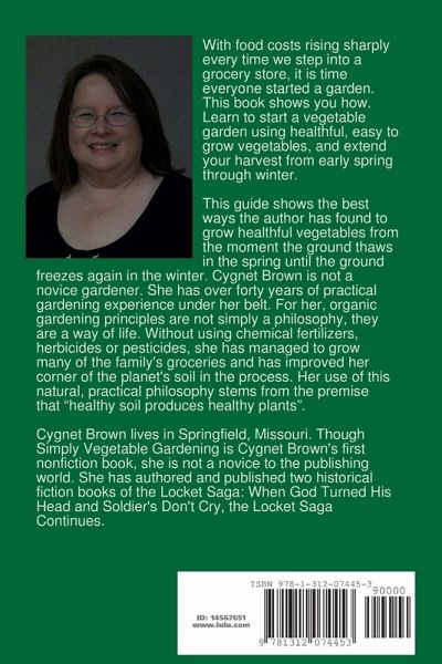 With food costs rising sharply every time we step into a grocery store, it is time everyone started a garden. This book shows you how. Learn to start a vegetable garden using healthful, easy to grow vegetables, and extend your harvest from early spring through winter. This guide shows the best ways the author has found to grow healthful vegetables from the moment the ground thaws in the spring until the ground freezes again in the winter. Cygnet Brown is not a novice gardener. She has over forty years of practical gardening experience under her belt. For her, organic gardening principles are not simply a philosophy, they are a way of life. Without using chemical fertilizers, herbicides or pesticides, she has managed to grow many of the family's groceries and has improved her corner of the planet's soil in the process. Her use of this natural, practical philosophy stems from the premise that "healthy soil produces healthy plants".