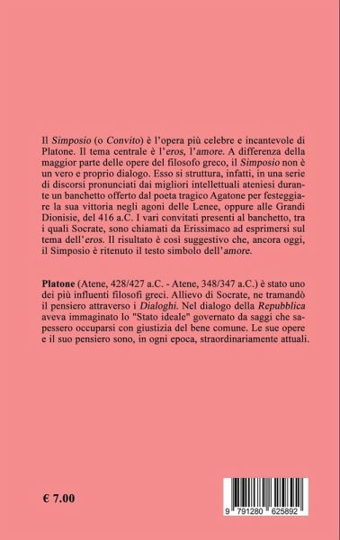 Il Simposio (o Convito) è l'opera più celebre e incantevole di Platone. Il tema centrale è l'eros, l'amore. A differenza della maggior parte delle opere del filosofo greco, il Simposio non è un vero e proprio dialogo. Esso si struttura, infatti, in una serie di discorsi pronunciati dai migliori intellettuali ateniesi durante un banchetto offerto dal poeta tragico Agatone per festeggiare la sua vittoria negli agoni delle Lenee, oppure alle Grandi Dionisie, del 416 a.C. I vari convitati presenti al banchetto, tra i quali Socrate, sono chiamati da Erissimaco ad esprimersi sul tema dell'eros. Il risultato è così suggestivo che, ancora oggi, il Simposio è ritenuto il testo simbolo dell'amore.