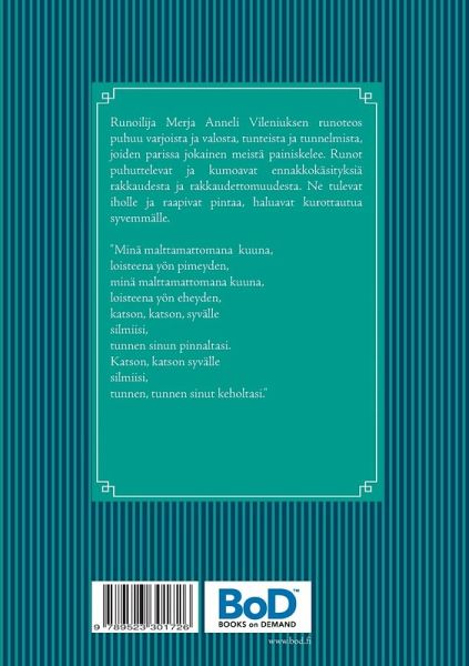 Runoilija Merja Anneli Vileniuksen runoteos puhuu varjoista ja valosta, tunteista ja tunnelmista, joiden parissa jokainen meistä painiskelee. Runot puhuttelevat ja kumoavat ennakkokäsityksiä rakkaudesta ja rakkaudettomuudesta. Ne tulevat iholle ja raapivat pintaa, haluavat kurottautua syvemmälle. "Minä malttamattomana kuuna, loisteena yön pimeyden, minä malttamattomana kuuna, loisteena yön eheyden, katson, katson, syvälle silmiisi, tunnen sinun pinnaltasi. Katson, katson syvälle silmiisi, tunnen, tunnen sinut keholtasi."