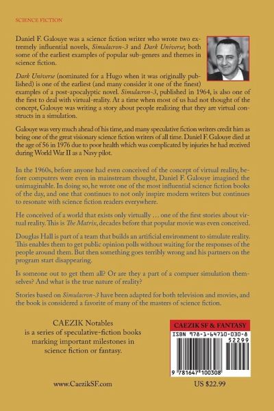Daniel F. Galouye was a science fiction writer who wrote two extremely influential novels, Simulacron-3 and Dark Universe; both some of the earliest examples of popular sub-genres and themes in science fiction. > (nominated for a Hugo when it was originally published) is one of the earliest (and many consider it one of the finest) examples of a post-apocalyptic novel. >, published in 1964, is one of the first to deal with virtual-reality. At a time when most of us had not thought of the concept, Galouye was writing a story about people realizing that they are virtual constructs in a simulation. In many ways Galouye was very much ahead of his time, even the science fiction field, and many science fiction writers credit him as being one of the great science fiction writers of the time. Daniel Galouye died at the age of 56 in 1976 due to poor health which was complicated by injuries he had received during World War II as a Navy pilot.