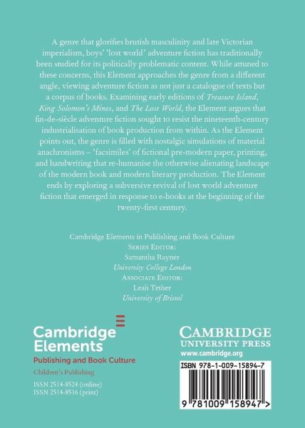 This Element approaches the genre of boys' adventure fiction as not just a catalogue of texts but a corpus of books. Examining early editions of Treasure Island, King Solomon's Mines, and The Lost World, the Element argues that fin-de-siecle adventure fiction sought to resist the nineteenth-century industrialisation of book production from within.