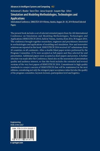 Thepresent book includes a set of selected extended papers from the 4thInternational Conference on Simulation and Modeling Methodologies, Technologiesand Applications (SIMULTECH 2014), held in Vienna, Austria, from 28 to 30 August2014. The conference brought together researchers, engineers and practitionersinterested in methodologies and applications of modeling and simulation. Newand innovative solutions are reported in this book. SIMULTECH 2014 received 167submissions, from 45 countries, in all continents. After a double blind paperreview performed by the Program Committee, 23% were accepted as full papers andthus selected for oral presentation. Additional papers were accepted as shortpapers and posters. A further selection was made after the Conference, basedalso on the assessment of presentation quality and audience interest, so thatthis book includes the extended and revised versions of the very best papers ofSIMULTECH 2014. Commitment to high quality standards isa majorconcern of SIMULTECHthat will be maintained in the next editions, considering not only thestringent paper acceptance ratios but also the quality of the programcommittee, keynote lectures, participation level and logistics.