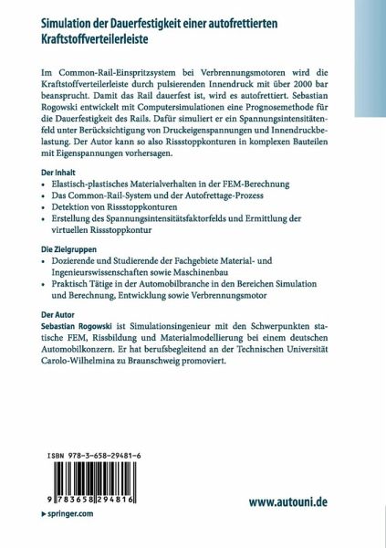 Im Common-Rail-Einspritzsystem bei Verbrennungsmotoren wird die Kraftstoffverteilerleiste durch pulsierenden Innendruck mit über 2000 bar beansprucht. Damit das Rail dauerfest ist, wird es autofrettiert. Sebastian Rogowski entwickelt mit Computersimulationen eine Prognosemethode für die Dauerfestigkeit des Rails. Dafür simuliert er ein Spannungsintensitätenfeld unter Berücksichtigung von Druckeigenspannungen und Innendruckbelastung. Der Autor kann so also Rissstoppkonturen in komplexen Bauteilen mit Eigenspannungen vorhersagen.