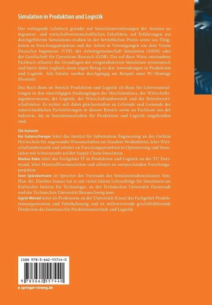 Das vorliegende Lehrbuch gründet auf Simulationsvorlesungen der Autoren an ingenieur- und wirtschaftswissenschaftlichen Fakultäten, auf Erfahrungen aus durchgeführten Simulationsstudien in der betrieblichen Praxis sowie aus Tätigkeiten in Forschungsprojekten und der Arbeit in Vereinigungen wie dem Verein Deutscher Ingenieure (VDI), der Arbeitsgemeinschaft Simulation (ASIM) oder der Gesellschaft für Operations Research (GOR). Das auf diese Weise entstandene Fachbuch erläutert die Grundlagen der ereignisdiskreten Simulation systematisch und bietet dabei zugleich einen engen Bezug zu den Anwendungen in Produktion und Logistik. Alle Inhalte werden durchgängig am Beispiel einer PC-Montage illustriert.