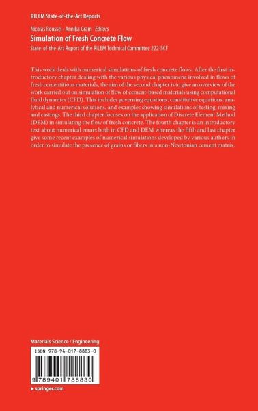 Introduction.- Physical Phenomena Involved In Flows Of Fresh Cementitious Materials.- Introduction.- Is Concrete A Discrete Or A Continuum Material?.- Macroscopic Rheological Behavior.- Multi-Scale Approach.- Particle Interactions.- Stability And Static Segregation.- Dynamic Segregation And Granular Blocking.- Fiber Orientation And Induced Anisotropy.- Thixotropy And Transient Behavior.- Behavior At The Walls.- References.- Computational Fluid Dynamics.- Introduction To Computational Fluid Dynamics.- Material Behaviour Law.- Solving A Fluid Problem.- Analytical Solutions.- Numerical Solution.- Simulation Of Fresh Cementitious Materials.- References.- Simulation Of Fresh Concrete Flow Using Discrete Element Method (Dem).- Introduction.- Discrete Element Method.- Simulating Concrete Flow Using Dem.- Calibration And Verification.- Industrial Applications.- Future Perspectives.- Summary.- Rerefences.- Numerical Errors In Cfd And Dem Modeling.- Introduction.- Basics Of Cfd - Understanding The Source Of Errors.- Numerical Errors (E1).- Coding Errors (E2).- User Error (E3).- Error From Input Uncertainties (U1).- Physical Model Uncertainty (U2).- Sources Of Numerical Error In Dem Simulations.- References.- Advanced Methods And Future Perspectives.- Introduction.- Case Studies.- References.