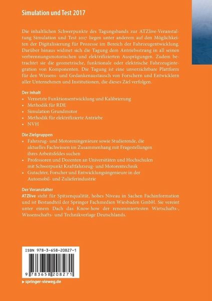 Die inhaltlichen Schwerpunkte des Tagungsbands zur ATZlive-Veranstaltung Simulation und Test 2017 liegen unter anderem auf den Möglichkeiten der Digitalisierung für Prozesse im Bereich der Fahrzeugentwicklung. Darüber hinaus widmet sich die Tagung dem Antriebsstrang in all seinen verbrennungsmotorischen und elektrifizierten Ausprägungen. Zudem betrachtet sie die geometrische, funktionale oder elektrische Fahrzeugintegration von Komponenten. Die Tagung ist eine unverzichtbare Plattform für den Wissens- und Gedankenaustausch von Forschern und Entwicklern aller Unternehmen und Institutionen, die dieses Ziel verfolgen.