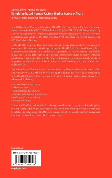 The Halden Man-Machine Laboratory (HAMMLAB) has been at the heart of human factors research at the OECD Halden Reactor Project (HRP). The HRP is sponsored by a group of national organizations, representing nuclear power plant regulators, utilities, and research institutions. The HRP is hosted by the Institute for Energy Technology (IFE) in Halden, Norway. HAMMLAB comprises three full-scale nuclear power plant control room research simulators. The simulator studies performed in HAMMLAB have traditionally been experimental in nature. In a simulator it is possible to study events as they unfold in real time, in a highly realistic operational environment under partially controlled conditions. This means that a wide range of human factors issues, which would be impossible or highly impracticable to study in real-life settings, can thus be addressed in HAMMLAB.Simulator-based Human Factors Studies Across 25 Years celebrates the twenty-fifth anniversary of HAMMLAB by reviewing the human factors studies performed in HAMMLAB across this time-span. A range of human factors issues have been addressed, including:- human-system interfaces;- alarm systems;- computerized procedures;- human-automation interaction;- staffing, teamwork and human reliability.The aim of HAMMLAB studies has always been the same: to generate knowledge for solving current and future challenges in nuclear power plant operation to contribute to safety. The outcomes of HAMMLAB studies have been used to support design and assessment of nuclear power plant control rooms.