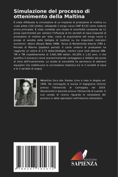 È stata effettuata la simulazione di un impianto di produzione di maltina su scala pilota (150 L/lotto), utilizzando il sorgo rosso CIAP R-132 come materia prima principale. È stato condotto uno studio di sensibilità composto da 11 prove sperimentali per valutare l'influenza di tre variabili di input (capacità di produzione di maltina per lotto, costo di acquisizione del sorgo rosso e prezzo di vendita delle bottiglie di maltina) su tre importanti indicatori economici: Valore Attuale Netto (VAN), Tasso di Rendimento Interno (TIR) e Periodo di Ritorno (payback period). Il costo unitario di produzione ha raggiunto un valore di 3,73 dollari/bottiglia, mentre sono stati ottenuti VAN, TIR e TIR rispettivamente di 3.661.000 dollari, 63,20% e 1,02 anni, il che qualifica il processo come economicamente vantaggioso e fattibile dal punto di vista dell'investimento. Lo studio di sensibilità ha permesso di ottenere equazioni che stabiliscono la correlazione statistica tra le 3 variabili di input e le 3 variabili di output.