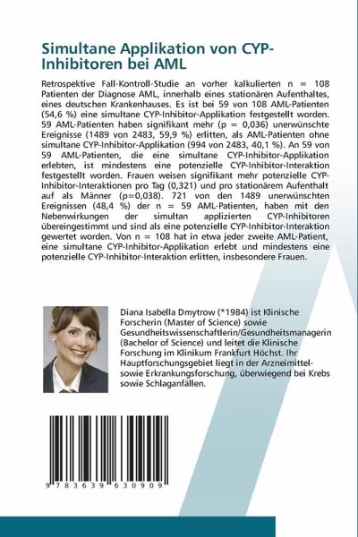 Retrospektive Fall-Kontroll-Studie an vorher kalkulierten n = 108 Patienten der Diagnose AML, innerhalb eines stationären Aufenthaltes, eines deutschen Krankenhauses. Es ist bei 59 von 108 AML-Patienten (54,6 %) eine simultane CYP-Inhibitor-Applikation festgestellt worden. 59 AML-Patienten haben signifikant mehr (p = 0,036) unerwünschte Ereignisse (1489 von 2483, 59,9 %) erlitten, als AML-Patienten ohne simultane CYP-Inhibitor-Applikation (994 von 2483, 40,1 %). An 59 von 59 AML-Patienten, die eine simultane CYP-Inhibitor-Applikation erlebten, ist mindestens eine potenzielle CYP-Inhibitor-Interaktion festgestellt worden. Frauen weisen signifikant mehr potenzielle CYP-Inhibitor-Interaktionen pro Tag (0,321) und pro stationärem Aufenthalt auf als Männer (p=0,038). 721 von den 1489 unerwünschten Ereignissen (48,4 %) der n = 59 AML-Patienten, haben mit den Nebenwirkungen der simultan applizierten CYP-Inhibitoren übereingestimmt und sind als eine potenzielle CYP-Inhibitor-Interaktion gewertet worden. Von n = 108 hat in etwa jeder zweite AML-Patient, eine simultane CYP-Inhibitor-Applikation erlebt und mindestens eine potenzielle CYP-Inhibitor-Interaktion erlitten, insbesondere Frauen.