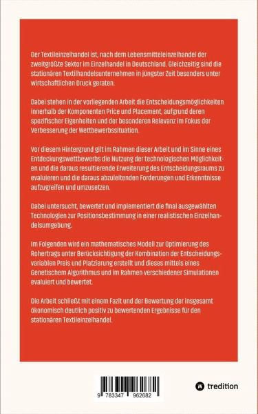 Der Textileinzelhandel ist, nach dem Lebensmitteleinzelhandel der zweitgrößte Sektor im Einzelhandel in Deutschland. Gleichzeitig sind die stationären Textilhandelsunternehmen in jüngster Zeit besonders unter wirtschaftlichen Druck geraten.Dabei stehen in der vorliegenden Arbeit die Entscheidungsmöglichkeiten innerhalb der Komponenten Price und Placement, aufgrund deren spezifischer Eigenheiten und der besonderen Relevanz im Fokus der Verbesserung der Wettbewerbssituation.Vor diesem Hintergrund gilt im Rahmen dieser Arbeit und im Sinne eines Entdeckungswettbewerbs die Nutzung der technologischen Möglichkeiten und die daraus resultierende Erweiterung des Entscheidungsraums zu evaluieren und die daraus abzuleitenden Forderungen und Erkenntnisse aufzugreifen und umzusetzen.Dabei untersucht, bewertet und implementiert die final ausgewählten Technologien zur Positionsbestimmung in einer realistischen Einzelhandelsumgebung.Im Folgenden wird ein mathematisches Modell zur Optimierung desRohertrags unter Berücksichtigung der Kombination der Entscheidungsvariablen Preis und Platzierung erstellt und dieses mittels eines Genetischem Algorithmus und im Rahmen verschiedener Simulationen evaluiert und bewertet.Die Arbeit schließt mit einem Fazit und der Bewertung der insgesamt ökonomisch deutlich positiv zu bewertenden Ergebnisse für den stationären Textileinzelhandel.