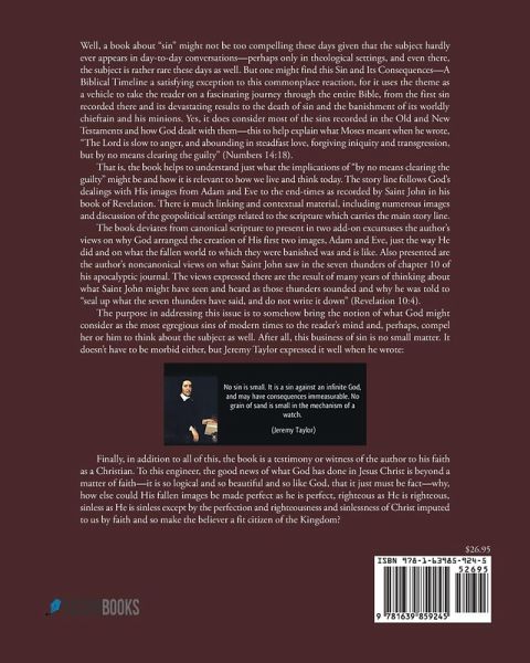 Well, a book about "sin" might not be too compelling these days given that the subject hardly ever appears in day-to-day conversations-perhaps only in theological settings, and even there, the subject is rather rare these days as well. But one might find this Sin and Its Consequences-A Biblical Timeline a satisfying exception to this commonplace reaction, for it uses the theme as a vehicle to take the reader on a fascinating journey through the entire Bible, from the first sin recorded there and its devastating results to the death of sin and the banishment of its worldly chieftain and his minions. Yes, it does consider most of the sins recorded in the Old and New Testaments and how God dealt with them-this to help explain what Moses meant when he wrote, "The Lord is slow to anger, and abounding in steadfast love, forgiving iniquity and transgression, but by no means clearing the guilty" (Numbers 14:18). That is, the book helps to understand just what the implications of "by no means clearing the guilty" might be and how it is relevant to how we live and think today. The story line follows God's dealings with His images from Adam and Eve to the end-times as recorded by Saint John in his book of Revelation. There is much linking and contextual material, including numerous images and discussion of the geopolitical settings related to the scripture which carries the main story line. The book deviates from canonical scripture to present in two add-on excursuses the author's views on why God arranged the creation of His first two images, Adam and Eve, just the way He did and on what the fallen world to which they were banished was and is like. Also presented are the author's noncanonical views on what Saint John saw in the seven thunders of chapter 10 of his apocalyptic journal. The views expressed there are the result of many years of thinking about what Saint John might have seen and heard as those thunders sounded and why he was told to "seal up what the seven thunders have said, and do not write it down" (Revelation 10:4). The purpose in addressing this issue is to somehow bring the notion of what God might consider as the most egregious sins of modern times to the reader's mind and, perhaps, compel her or him to think about the subject as well. After all, this business of sin is no small matter. It doesn't have to be morbid either, but Jeremy Taylor expressed it well when he wrote: No sin is small. It is a sin against an infinite God and may have consequences immeasurable. No grain of sand is small in the mechanism of a watch. Finally, in addition to all of this, the book is a testimony or witness of the author to his faith as a Christian. To this engineer, the good news of what God has done in Jesus Christ is beyond a matter of faith-it is so logical and so beautiful and so like God, that it just must be fact-why, how else could His fallen images be made perfect as he is perfect, righteous as He is righteous, sinless as He is sinless except by the perfection and righteousness and sinlessness of Christ imputed to us by faith and so make the believer a fit citizen of the Kingdom?