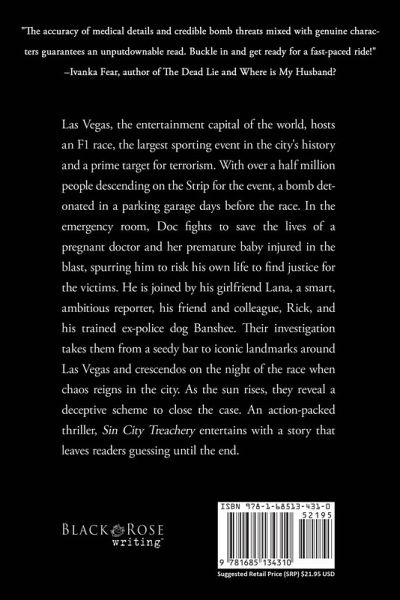 "The accuracy of medical details and credible bomb threats mixed with genuine characters guarantees an unputdownable read. Buckle in and get ready for a fast-paced ride!" -Ivanka Fear, author of The Dead Lie and Where is My Husband? Las Vegas, the entertainment capital of the world, hosts an F1 race, the largest sporting event in the city's history and a prime target for terrorism. With over a half million people descending on the Strip for the event, a bomb detonated in a parking garage days before the race. In the emergency room, Doc fights to save the lives of a pregnant doctor and her premature baby injured in the blast, spurring him to risk his own life to find justice for the victims. He is joined by his girlfriend Lana, a smart, ambitious reporter, his friend and colleague, Rick, and his trained ex-police dog Banshee. Their investigation takes them from a seedy bar to iconic landmarks around Las Vegas and crescendos on the night of the race when chaos reigns in the city. As the sun rises, they reveal a deceptive scheme to close the case. An action-packed thriller, Sin City Treachery entertains with a story that leaves readers guessing until the end. Read the AJ Docker and Banshee Thrillers in any order, or follow the series from the beginning:Last Patient of the Night Faulty Bloodline Sin City Treachery Deadly Equation Terminal Exchanges - coming October 2025 The Phantom Files - coming March 2026