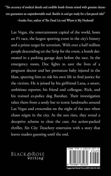 "The accuracy of medical details and credible bomb threats mixed with genuine characters guarantees an unputdownable read. Buckle in and get ready for a fast-paced ride!" -Ivanka Fear, author of The Dead Lie and Where is My Husband? Las Vegas, the entertainment capital of the world, hosts an F1 race, the largest sporting event in the city's history and a prime target for terrorism. With over a half million people descending on the Strip for the event, a bomb detonated in a parking garage days before the race. In the emergency room, Doc fights to save the lives of a pregnant doctor and her premature baby injured in the blast, spurring him to risk his own life to find justice for the victims. He is joined by his girlfriend Lana, a smart, ambitious reporter, his friend and colleague, Rick, and his trained ex-police dog Banshee. Their investigation takes them from a seedy bar to iconic landmarks around Las Vegas and crescendos on the night of the race when chaos reigns in the city. As the sun rises, they reveal a deceptive scheme to close the case. An action-packed thriller, Sin City Treachery entertains with a story that leaves readers guessing until the end. Read the AJ Docker and Banshee Thrillers in any order, or follow the series from the beginning:Last Patient of the Night Faulty Bloodline Sin City Treachery Deadly Equation Terminal Exchanges - coming October 2025 The Phantom Files - coming March 2026