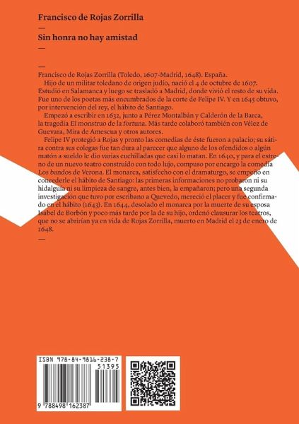 Sin honra no hay amistad es una comedia de honor de Francisco de Rojas Zorrilla. Esta obra se articula alrededor de dos caballeros afectados por la deshonra de sus hermanas:don Antonio, cuya hermana Inés fue raptada de su casa tiempo atrás por seis desconocidos que actuaban por encargo de un amante oculto. Y Don Bernardo, cuyo honor está en entredicho por la conducta indecorosa de doña Juana, quien permitió la entrada en la casa de dos admiradores a los que ocultó en sendos cuartos. Entre los enredos de Sin honra no hay amistad se deja entrever lo que don Antonio ignora: don Bernardo es el…mehr