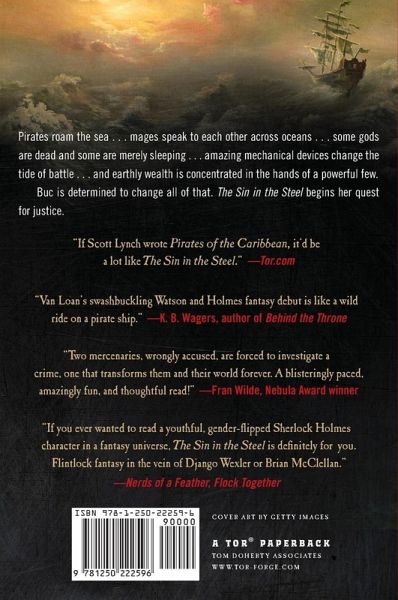 Pirates roam the seas...mages speak to each other across oceans...some gods are dead and some are merely sleeping...amazing mechanical devices change the tide of battle...and earthly wealth is concentrated in the hands of a powerful few. Buc is determined to change all of that. The Sin in the Steel begins her quest for justice. "If Scott Lynch wrote Pirates of the Caribbean, it'd be a lot like The Sin in the Steel."- Tor.com "Van Loan's swashbuckling Watson and Holmes fantasy debut is like a wild ride on a pirate ship."-K.B. Wagers, author of Behind the Throne HEROES FOR HIRE They Don't Come Cheap Buc: A brilliant former street-rat, not even 18 years old, with a mind that leaps from clues to conclusions in the blink of an eye. Eld: Despite his relative youth, a military veteran with a hidden past and Buc's partner-in-crime. No. In crime-solving. It's been weeks since ships last returned to the magnificent island nation of Servenza with bounty from the Shattered Coast, putting the whole Empire at risk of economic collapse. Hired to investigate, Buc and Eld discover that the trade routes have become the domain of a sharp-eyed pirate queen who sinks all who defy her. To fix things, all they have to do is sink the Widowmaker's ship. Unfortunately for Buc, the gods have other plans. Unfortunately for the gods, so does Buc.