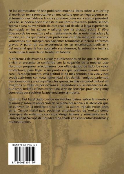 ""Basándose en el principio budista de la impermanencia, la autora reflexiona sobre el fenómeno del cambio que se manifiesta en todos los aspectos de la vida. Asimismo, ofrece una serie de consejos prácticos y muy concretos para cultivar una actitud de apertura ante la muerte, que nos permite acompañar a los que están más cerca del umbral sin exigirnos ni exigirles perfección. En los últimos años se han publicado muchos libros sobre la muerte y el morir, un tema provocativo en una cultura que se niega a pensar en la muerte y prefiere creer en la eterna juventud. Por eso, se podría decir que Sin miedo a la muerte es un libro subversivo. Judith Lief nos acerca a este tema desde la larga experiencia acumulada en los cursos y talleres que ha dictado sobre El libro tibetano de los muertos y el acercamiento a la muerte, en los que participan profesionales de la salud, estudiantes, voluntarios que trabajan con pacientes terminales e incluso enfermos graves. A partir de esa experiencia, de las enseñanzas budistas sobre el tema y del material que le han aportado sus alumnos, la autora nos invita a contemplar la muerte de frente, sin tabúes. A diferencia de muchos cursos y publicaciones en los que el llamado a vivir el presente se confunde con la negación de la muerte, este libro nos propone abrirnos a ella sin velos protectores, para llegar a un punto en que podamos mirarla cara a cara, sin temor. Paradójicamente, esta forma de acercarnos a la muerte le da más sentido a la vida y nos ayuda a abrimos con toda honestidad a los demás -amigos, parientes, desconocidos- y a acompañar a los que están más cerca del umbral sin exigirnos ni exigirles perfecciones. Basándose en las enseñanzas del budismo sobre la impermanencia y el proceso de morir, Judith Lief nos ofrece una serie de consejos prácticos y muy concretos para cultivar una actitud de apertura ante la muerte. JUDITH L. LIEF ha dictado cursos en muchos países sobre la muerte y el morir y sobre la aplicación práctica de la plena presencia y la atención que se cultivan en la meditación budista. La autora, que es instructora avanzada de meditación, dirige talleres y seminarios sobre la muerte y el morir en la Universidad Naropa de Boulder, en Estados Unidos, y da charlas sobre el tema en encuentros budistas y multiculturales sobre el tema. Trabajó varios años en el Centro Maitri para pacientes ambulatorios de Yonkers, en Nueva York, como consejera de enfermos de sida. Editorial Maitri fue creada en 2001 con la intención de difundir textos sobre distintas dimensiones de la espiritualidad. Su catálogo incluye ensayos de autores contemporáneos sobre la búsqueda espiritual y colecciones de cuentos tradicionales. En 2015 Maitri lanzó una línea de narrativa contemporánea con la publicación de """"Wabi sabi"""". Maitri es una palabra sánscrita que significa "benevolencia", "cordialidad".