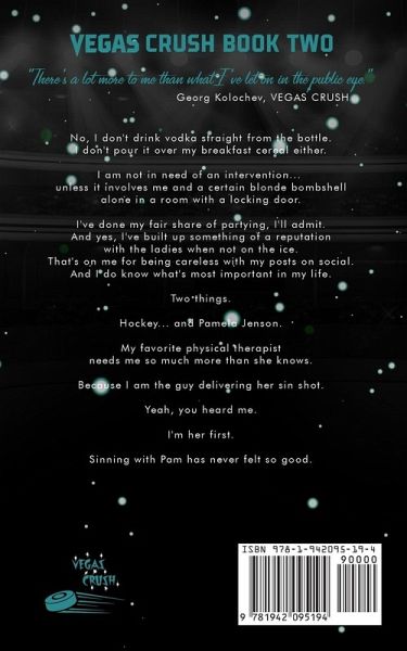 "There's a lot more to me than what I've let on in the public eye." -Georg Kolochev, VEGAS CRUSH No, I don't drink vodka straight from the bottle. I don't pour it over my breakfast cereal either. I am not in need of an intervention... unless it involves me and a certain blonde bombshell alone in a room with a locking door. I've done my fair share of partying, I'll admit. And yes, I've built up something of a reputation with the ladies when not on the ice. That's on me for being careless with my posts on social. And I do know what's most important in my life. Two things. Hockey...and Pamela Jenson. My favorite physical therapist needs me so much more than she knows. Because I am the guy delivering her sin shot. Yeah, you heard me. I'm her first. Sinning with Pam has never felt so good.