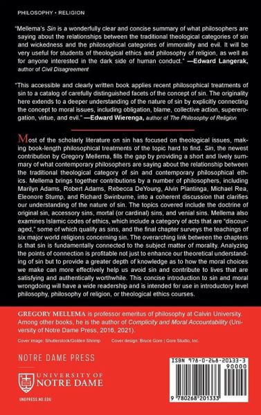 This book brings clarification to our understanding of the nature of sin and will be of interest to nonphilosophers as well as philosophers. Most of the scholarly literature on sin has focused on theological issues, making book-length philosophical treatments of the topic hard to find. Sin, the newest contribution by Gregory Mellema, fills the gap by providing a short and lively summary of what contemporary philosophers are saying about the relationship between the traditional theological category of sin and contemporary philosophical ethics. Mellema brings together contributions by a number of philosophers, including Marilyn Adams, Robert Adams, Rebecca DeYoung, Alvin Plantinga, Michael Rea, Eleonore Stump, and Richard Swinburne, into a coherent discussion that clarifies our understanding of the nature of sin. The topics covered include the doctrine of original sin, accessory sins, mortal (or cardinal) sins, and venial sins. Mellema also examines Islamic codes of ethics, which include a category of acts that are "discouraged," some of which qualify as sins, and the final chapter surveys the teachings of six major world religions concerning sin. The overarching link between the chapters is that sin is fundamentally connected to the subject matter of morality. Analyzing the points of connection is profitable not just to enhance our theoretical understanding of sin but to provide a greater depth of knowledge as to how the moral choices we make can more effectively help us avoid sin and contribute to lives that are satisfying and authentically worthwhile. This concise introduction to sin and moral wrongdoing will have a wide readership and is intended for use in introductory level philosophy, philosophy of religion, or theological ethics courses.