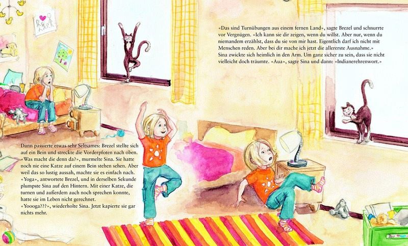 Das Buch ist toll. Ich kannte schon…mehrEs geht um Sina. Sina ist traurig, weil sie umziehen musste in eine neue Stadt, wo sie niemanden kennt. Damit sie nicht so alleine ist bekommt sie eine Katze geschenkt. Die Katze kann aber sprechen und Yoga machen, das hat sie von ihrer Oma gelernt. Sie zeigt Sina ganz viele Yoga-Übungen und dabei kann sich Sina entspannen und ist dann nicht mehr so traurig.