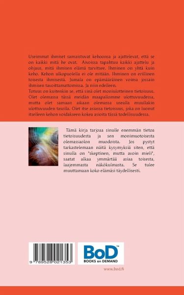 Useimmat ihmiset samaistuvat kehoonsa ja ajattelevat, että se on kaikki mitä he ovat. Aivoissa tapahtuu kaikki ajattelu ja ohjaus, mitä ihmisen elämä tarvitsee. Ihminen on yhtä kuin keho. Kehon ulkopuolella ei ole mitään. Ihminen on erillinen toisesta ihmisestä. Jumala on epämääräinen voima jossain ihmisen tavoittamattomissa. Ja niin edelleen. Totuus on kuitenkin se, että sinä olet moniulotteinen tietoisuus. Olet olemassa tässä meidän maapallomme ulottuvuudessa, mutta olet samaan aikaan olemassa usealla muullakin ulottuvuuden tasolla. Olet itse asiassa tietoisuus, joka on luonut itselleen kehon voidakseen kokea asioita tässä todellisuudessa. Tämä kirja tarjoaa sinulle enemmän tietoa tietoisuudesta ja sen monimuotoisesta olemassaolon muodoista. Jos pystyt tarkastelemaan näitä kysymyksiä siten, että sinulla on "skeptinen, mutta avoin mieli", saatat alkaa ymmärtää asiaa toisesta, laajemmasta näkökulmasta. Se tulee muuttamaan koko elämäsi täydellisesti.