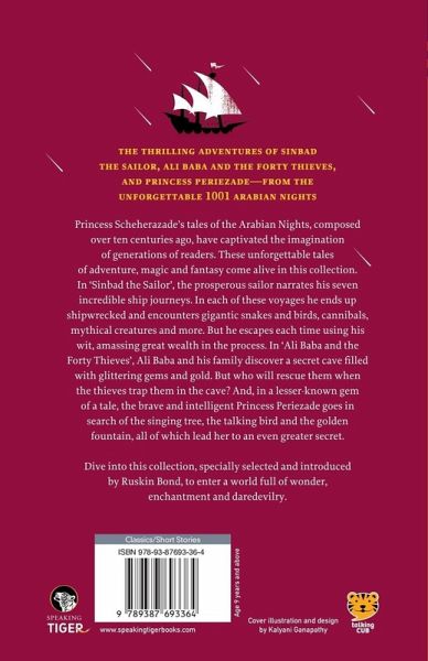 The thrilling adventures of Sinbad the sailor, Ali Baba and the forty thieves, and Princess Periezade—from the unforgettable 1001 Arabian Nights. Princess Scheherazade’s tales of the Arabian Nights, composed over ten centuries ago, have captivated the imagination of generations of readers. These unforgettable tales of adventure, magic and fantasy come alive in this collection. In ‘Sinbad the Sailor’, the prosperous sailor narrates his seven incredible ship journeys. In each of these voyages he ends up shipwrecked and encounters gigantic snakes and birds, cannibals, mythical creatures and more. But he escapes each time using his wit, amassing great wealth in the process. In ‘Ali Baba and the Forty Thieves’, Ali Baba and his family discover a secret cave filled with glittering gems and gold. But who will rescue them when the thieves trap them in the cave? And, in a lesser-known gem of a tale, the brave and intelligent Princess Periezade goes in search of the singing tree, the talking bird and the golden fountain, all of which lead her to an even greater secret. Dive into this collection, specially selected and introduced by Ruskin Bond, to enter a world full of wonder, enchantment and daredevilry.