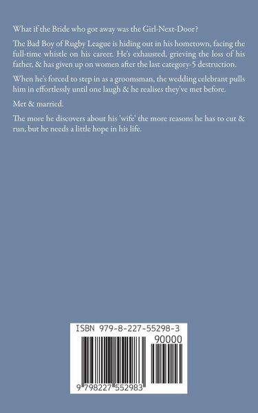 What if the Bride who got away was the Girl-Next-Door? The Bad Boy of Rugby League is hiding out in his hometown, facing the full-time whistle on his career. He's exhausted, grieving the loss of his father, & has given up on women after the last category-5 destruction. When he's forced to step in as a groomsman, the wedding celebrant pulls him in effortlessly until one laugh & he realises they've met before. Met & married. The more he discovers about his 'wife' the more reasons he has to cut & run, but he needs a little hope in his life.