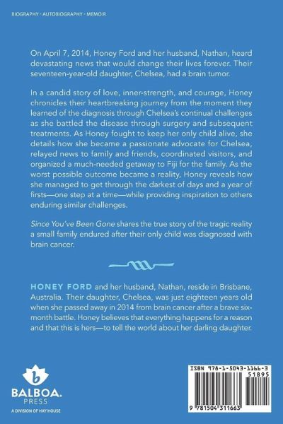 On April 7, 2014, Honey Ford and her husband, Nathan, heard devastating news that would change their lives forever. Their seventeen-year-old daughter, Chelsea, had a brain tumor. In a candid story of love, inner-strength, and courage, Honey chronicles their heartbreaking journey from the moment they learned of the diagnosis through Chelsea's continual challenges as she battled the disease through surgery and subsequent treatments. As Honey fought to keep her only child alive, she details how she became a passionate advocate for Chelsea, relayed news to family and friends, coordinated visitors, and organized a much-needed getaway to Fiji for the family. As the worst possible outcome became a reality, Honey reveals how she managed to get through the darkest of days and a year of firsts-one step at a time-while providing inspiration to others enduring similar challenges. Since You've Been Gone shares the true story of the tragic reality a small family endured after their only child was diagnosed with brain cancer.