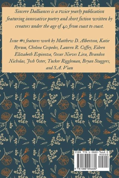 Sincere Dalliances is a twice yearly publication featuring innovative poetry and short fiction written by creators under the age of 40 from coast to coast. Issue #1 features work by Matthew D. Albertson, Katie Byrum, Chelsea Cespedes, Lauren R. Coffey, Eileen Elizabeth Espinoza, Oscar Nieves Lira, Brandon Nicholas, Josh Oster, Tucker Riggleman, Bryan Staggers, and S.A. Viau