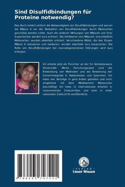 Das Buch erklärt einfach die Notwendigkeit von Disulfidbindungen und warum die RNase A vor der Reduktion von Disulfidbindungen durch Metosartan geschützt werden sollte. Auch die anderen Wirkungen von RNaseA und ihrer Superfamilie werden kurz erörtert. Die Inhibitoren von RNaseA, einschließlich Metosartan, wurden ebenfalls erörtert. Verschiedene Mittel, die das Enzym RNase A reduzieren und oxidieren, wurden ebenfalls kurz besprochen. Die Rolle von Disulfidbindungen bei neurodegenerativen Störungen wird kurz erläutert.