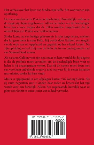 Het verhaal over het leven van Sinder, zijn liefde, het avontuur en zijn opoffering. De mens overheerst in Perion en daarbuiten. Onsterfelijke volken en de magie zijn bijna uitgebannen. Alleen het helen van de beschadigde bron kan ervoor zorgen dat de rollen worden omgedraaid, dat de onsterfelijken in Perion weer zullen heersen. Sinder komt, na een heftige gebeurtenis in zijn jonge leven, erachter dat hij geen mens is maar Felin. Hij wordt door Galbon, een magiër van de orde van zes opgehaald en opgeleid op het eiland Amreh. Na zijn opleiding vertrekt hij naar de Felin die in een ondergrondse stad van Soutend Stad wonen. Als na jaren Galbon voor zijn neus staat en hem verteld dat hij degene is die de profetie moet vervullen om de beschadigde bron weer te helen is hij onaangenaam verrast. Dat hij dit samen moet doen met een voor hem onbekende vrouw is niet iets waar hij in eerste instantie naar uitziet, totdat hij haar vindt. Moira is opgegroeid in een afgelegen kasteel van koning Gersu. Als zij ruim negentien jaar is vinden haar vader en broers dat het tijd wordt voor een huwelijk. Alleen het zogenaamde huwelijk waar ze plots voor komt te staan is niet wat ze had verwacht.