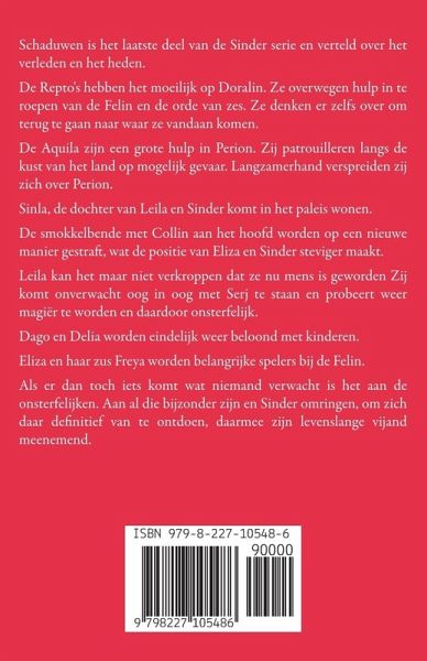 Schaduwen is het laatste deel van de Sinder serie en verteld over het verleden en het heden. De Repto's hebben het moeilijk op Doralin. Ze overwegen hulp in te roepen van de Felin en de orde van zes. Ze denken er zelfs over om terug te gaan naar waar ze vandaan komen. De Aquila zijn een grote hulp in Perion. Zij patrouilleren langs de kust van het land op mogelijk gevaar. Langzamerhand verspreiden zij zich over Perion. Sinla, de dochter van Leila en Sinder komt in het paleis wonen. De smokkelbende met Collin aan het hoofd worden op een nieuwe manier gestraft, wat de positie van Eliza en Sinder steviger maakt.. Leila kan het maar niet verkroppen dat ze nu mens is geworden Zij komt onverwacht oog in oog met Serj te staan en probeert weer magiër te worden en daardoor onsterfelijk. Dago en Delia worden eindelijk weer beloond met kinderen. Eliza en haar zus Freya worden belangrijke spelers bij de Felin. Als er dan toch iets komt wat niemand verwacht is het aan de onsterfelijken, aan al die bijzonder zijn en Sinder omringen, om zich daar definitief van te ontdoen, daarmee zijn levenslange vijand meenemend.