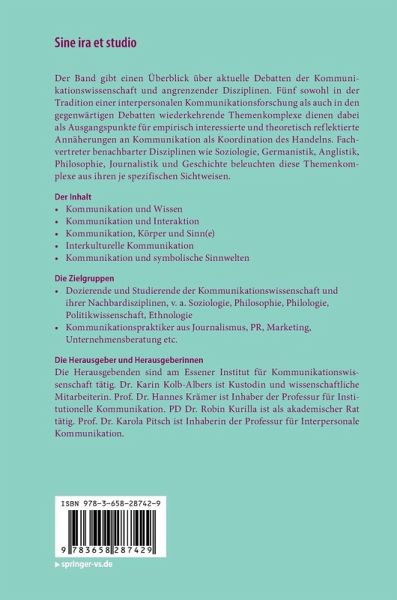 Kommunikation und Wissen.- Kommunikation und Interaktion.- Kommunikation, Körper und Sinn(e).- Interkulturelle Kommunikation.- Kommunikation und symbolische Sinnwelten.