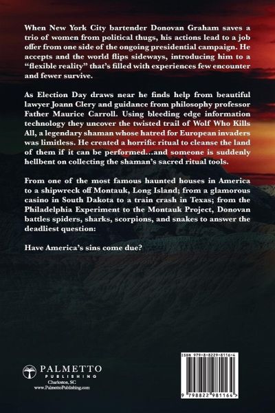Bartender Donovan Graham discovers someone wants to destroy the country with an ancient, horrifying ritual. Have America's sins come due? In SINEATER Donovan's courage, displayed when he rescues three women from political thugs in New York City, thrusts him into a world where reality can be flexible...and deadly. Newfound employment in a presidential campaign introduces him to sharp-witted lawyer Joann Clery and philosophy professor Father Maurice Carroll, who provide him with wisdom and guidance along with bleeding-edge information technology. Donovan discovers the sinister path of Wolf Who Kills All, an evil shaman known for his limitless hatred towards Europeans. Wolf Who Kills All devised a ritual beyond cruelty to purge the land of its invaders but was never able to complete it. As the election draws nearer, however, someone seems determined to finish the job. Traveling from the chilling corners of America's most haunted house to a shipwreck off Montauk, Long Island, from the glitz of a South Dakota casino to a train wreck in Texas, and from the Philadelphia Experiment to the Montauk Project, Donovan braves things that crawl, swim and slither to prevent the collection of sacred tools required for Wolf Who Kills All's lethal plan. SINEATER pushes the boundaries of the thriller genre, weaving history, the supernatural, modern politics and futuristic technology into a compelling narrative that culminates in a final battle between darkness and valor. Donovan must learn which is stronger in America's soul if he is going to save the country.