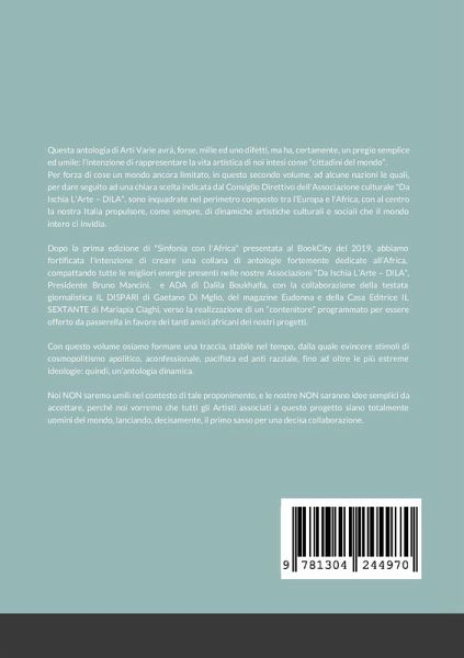 Questa antologia di Arti Varie avrà, forse, mille ed uno difetti, ma ha, certamente, un pregio semplice ed umile: l'intenzione di rappresentare la vita artistica di noi intesi come "cittadini del mondo". Per forza di cose un mondo ancora limitato, in questo secondo volume, ad alcune nazioni le quali, per dare seguito ad una chiara scelta indicata dal Consiglio Direttivo dell'Associazione culturale "Da Ischia L'Arte - DILA", sono inquadrate nel perimetro composto tra l'Europa e l'Africa, con al centro la nostra Italia propulsore, come sempre, di dinamiche artistiche culturali e sociali che il mondo intero ci invidia. Dopo la prima edizione di "Sinfonia con l'Africa" presentata al BookCity del 2019, abbiamo fortificata l'intenzione di creare una collana di antologie fortemente dedicate all'Africa, compattando tutte le migliori energie presenti nelle nostre Associazioni "Da Ischia L'Arte - DILA", Presidente Bruno Mancini, e ADA di Dalila Boukhalfa, con la collaborazione della testata giornalistica IL DISPARI di Gaetano Di Mglio, del magazine Eudonna e della Casa Editrice IL SEXTANTE di Mariapia Ciaghi, verso la realizzazione di un "contenitore" programmato per essere offerto da passerella in favore dei tanti amici italiani e africani dei nostri progetti. Con questo volume osiamo formare una traccia, stabile nel tempo, dalla quale evincere stimoli di cosmopolitismo apolitico, aconfessionale, pacifista ed anti razziale, fino ad oltre le più estreme ideologie: quindi, un'antologia dinamica. Noi, e questa non è un'affermazione in contraddizione con quanto scritto nel primo paragrafo, NON saremo umili nel contesto di tale proponimento, e le nostre NON saranno idee semplici da accettare, perché noi vorremo che tutti gli Artisti associati a questo progetto "Sinfonia con L'Africa" siano totalmente uomini del mondo, lanciando, decisamente, il primo sasso. Per il prossimo futuro aspettiamo la partecipazione di molti Artisti, uniti nell'abbracciarsi in vincoli indissolubili con il fuoco sacro dell'Arte nella più pura dimensione del rispetto umano.