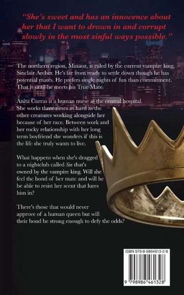 "She's sweet and has an innocence about her that I want to drown in and corrupt slowly in the most sinful ways possible." The northern region, Minaoz, is ruled by the current vampire king, Sinclair Archer. He's far from ready to settle down though he has potential mates. He prefers single nights of fun than commitment. That is until he meets his True Mate. Anita Carras is a human nurse at the central hospital. She works three times as hard as the other creatures working alongside her because of her race. Between work and her rocky relationship with her long term boyfriend she wonders if this is the life she truly wants to live. What happens when she's dragged to a nightclub called Sin that's owned by the vampire king. Will she feel the bond of her mate and will he be able to resist her scent that lures him in? There's those that would never approve of a human queen but will their bond be strong enough to defy the odds?